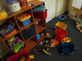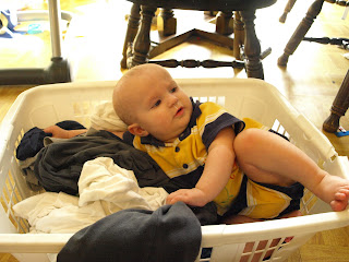 "Hey, somebody help me!" Cai dragged the laundry basket into the kitchen - Riah had climbed in it and, of course, gotten himself stuck. Thankfully Cai pulled him to me instead of "helping" Riah himself!